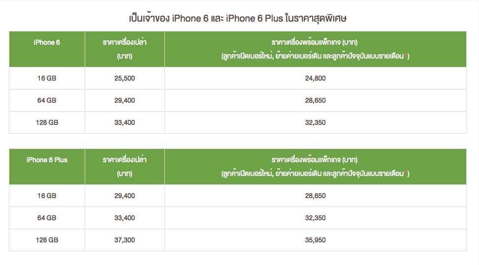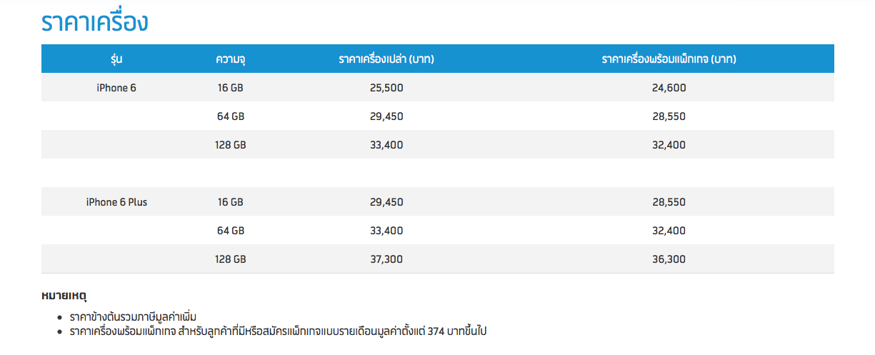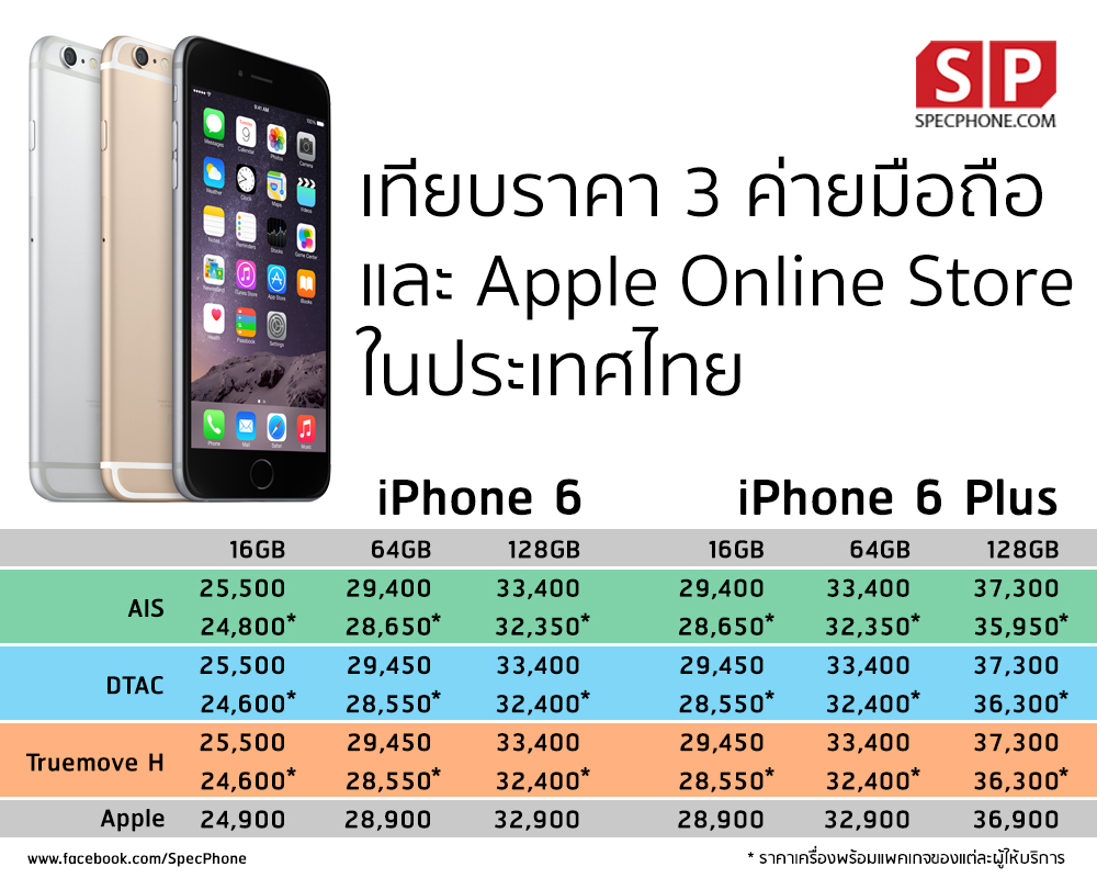 ราคาของ iPhone 6 และ iPhone 6 Plus มีการปรับเปลี่ยนจากใน iPhone 5s พอสมควรครับ และตอนนี้ทุกเจ้าทั้ง AIS, Dtac และ Truemove-H ก็เปิดราคา iPhone 6 และ iPhone 6 Plus ของตัวเองเป็นที่เรียบร้อยแล้วด้วย ว่าแต่จะมีราคาเท่าไหร่กันบ้าง มาดูเลยครับ